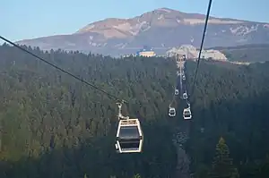 Cable cars (Teleferik) ascend from Bursa's upper district of Teferrüç, served by dolmuş and Bus 94 from downtown. The creaky old telecabins were replaced in 2014 by 8-person gondolas, with a car every 20 secs on an 8.8 km continuous single loop. The 🌍 base station is at 395 m and there's a midway station (with no facilities) at 🌍 Kadıyayla. The ride continues to 🌍 Sarıalan ("yellow field") at 1634 m elevation. You can hike from there, but for the hotel strip and ski areas board the next teleferik to 🌍 Kurbağa Kaya ("frog rock") at 1870 m. The cars run daily 10:00-18:00 and the ride takes 30 min. In 2023, the fare is 490 TL return. Expect very heavy queuing in winter, with wait times of up to 1.5 hr especially when going back to Bursa towards end of the day.