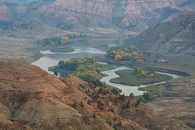 The Breaks is a series of badland areas characterized by rock outcroppings, steep bluffs and grassy plains. The valley of the Upper Missouri was originally laid down in horizontal layers, the sediments and shorelines of a great inland sea that once covered most of the Great Plains. These layers have since been folded, faulted, uplifted, modified by volcanic activity and sculpted by glaciers. Erosion then added to the variety seen along the river today, a landform known as the Breaks.