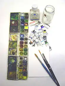 The texture and quality of paper to use is often debated, from loose cold-pressed sheafs to the much beloved Moleskine notebooks. Flat-lying and spiral bound sketchpads both have their own supporters. Coloured paper gives a different challenge compared to plain white paper. Watercolours require thicker paper of 190gsm (90lb) and above to absorb the extra water and paint. Watercolour postcards are particularly popular in Japan. There are different varieties of inks and brands of pens: fountain and quill pens, permanent Indian ink and Chinese ink sticks etc.