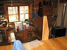 Kitchen facilities in a wilderness hut: wood carrying racks, tinder on a stool, wood stove, cooking equipment including a bucket for fetching water from the stream, gas stove (with closed lid) for cooking, instructions. Drying hooks above the stove. Guest book on the table in front.