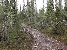 • 🌍 Ruijanpolku (turn from E75 to Sompiojärventie forest road at Vuotso, drive 14 km to the shore of Sompiojärvi, with camping area and other infrastructure – or start in Laanila/Kiilopää/Kakslauttanen). 35 km trail through Sompio to Kiilopää, Kakslauttanen or Laanila, part of the former trail between the Bothnian Bay and the coast of Finnmark (Finnish: Ruija) at the Arctic Ocean. It is mentioned as early as in the 16th century, but fell in disuse at the beginning of the 19th century. This section is now a marked hiking trail. Some of the historic markings (cairns, i.e. stone heaps) remain and must not be touched. The leg through Sompio is tough, with quite rough terrain. As camping is not allowed here, the 15 km (9.3 mi) leg between Sompiojärvi and the Kaptukaislampi lean-to shelter, with a 2×1.5 km sidetrip to the top of Terävä-Nattanen, has to be done in one day (there is a campfire site for a break before or after the sidetrip). Otherwise there are lean-to shelters 9–12 km (5.5–7.5 mi) apart. The trail crosses the road and some trails of the Kakslauttanen-Kiilopää area, allowing some variations in that end. Sompio is a strict nature reserve, leave no trace and keep to the trail.