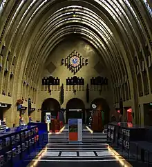 - 🌍 Postkantoor Utrecht (Hoofdpostkantoor), Neude 11. The former Main Post Office is an outstanding and surprising building. The Utrecht main Post Office is a great example of Dutch Art Deco architecture. The Post Office, on the Neude Square, was designed by the architect J. Crouwel and completed in 1924. The barrel-vaulted ceiling is made up of glazed yellow-brick ribs alternated with diagonal glass panes that fill the hall with natural light. The black-and-white floor is set off by five carved black statues set in the walls, each representing a continent. America is a stylized American Indian with two buffalo at his feet. Over the main entrance are magnificent stained glass windows. It was renovated in 2019/2020 and opened for public on 13 March 2020. The impressive central hallway is accessible from the Neude square and offers space for the central library, several restaurants, guarded bicycle parking and a supermarket.