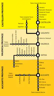 • A number of services run between Barcelona and the city of Murcia, calling at Castellón, Valencia and Alicante. While this provides a connection to the region from Murcia, these trains are slower than the Euromed service for travellers going from Barcelona and are therefore less useful for intra-region travel.