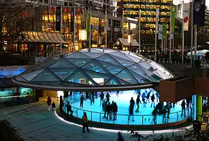 - π Robson Square, 800 Block, Robson St (Robson & Howe St). Both an office building and public space designed by Vancouver architect Arthur Erikson, it houses the Provincial Courts and a satellite UBC campus. The building, which was built to represent a skyscraper on its side, is noted for its use of water and greenery and is mostly underground. The public space features a skating rink underneath Robson Street, which is the only outdoor rink in Vancouver. Skating is available during winter and is free, skate rentals are $3.