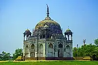 - 🌍 Lal Khan Tomb (north of Malviya Bridge next to Rajghat). 9 Am - 5 PM. Lal Khan was the minister and commander of Balwant Sing (reign: 1740 – 70) the King of Varanasi (then Benaras). His last wish was to be buried in such a place so that he could keep an eye on the gateway of the royal palace. The king kept his last wish by building him a magnificent tomb of the northern edge of Varanasi. The tomb stands at the centre of a Mughal garden, marked with four chhatris on four corners out of which three stand to this day. The tomb stands on an elevated square plinth, which also houses several graves. so that he could keep an eye on the gateway of the royal palace. The tomb is crowned with a single dome flanked with chhatris on four corners. Each side has three arches with the central arches slightly higher than the side ones. The highlight of the tomb is the decorative multi-coloured tile work. Sadly, the colours have faded, robbing the tomb of its elegant look. ₹ 20 (same ticket for Lal Khan Tomb and Rajghat).