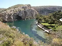 - 🌍 Lake Vouliagmeni, Vouliagmeni. Immediately to the south of town and very close to the sea, a rare geophysical formation is to be found that gave the suburb its modern name: Lake Vouliagmeni ("Sunk Lake"), a small brackish water lake fed by underground currents seeping through the mass of Mount Hymettus. It was once a large cavern that collapsed following an earthquake, probably during the early Middle Ages. The outline of the collapsed cavern roof can be clearly discerned from a distance. The lake stands at a 40 cm elevation. It continues deep inside the mountain in an underwater cave never fully explored, as its end seems impossible to trace even by employing sonar detection. Many underwater expeditions have been carried out in order to chart it, and a few amateur divers have drowned trying. Because of its constant and comfortable water temperature (24 degrees Celsius year round), the lake functions as a year-round spa, there is an entrance fee. In the area operates a restaurant-bar. 8€, children under 5 for free.