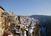 Veliko Tarnovo (Велико Търново, also transliterated as Veliko Turnovo), meaning Great Thorny City in Old Bulgarian, is a mountain city located in the north of Bulgaria. It has often been called the "City of the Tsars", as it was historically the capital of the Bulgarian political entities. It is located around a major bend in the Yantra River that carved steep hillsides on which the Old Town is built. The Old Town is separated into 3 hills: Tsarevets, Trapezitsa, and Sveta Gora, while the New Town spills out into a flatter region to the west of the hills.
