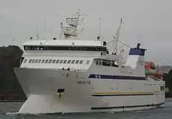 The car and passenger ferry Herjólfur has scheduled trips daily between a harbour 🌍 Landeyjahöfn, on the mainland coast south of Hvolsvöllur, 11 km from Heimaey. When weather and harbor conditions permit, Herjólfur operates on this much shorter run, making four or five return journeys daily. Fares are lower on this faster route, and the one-way trip requires approximately 30 minutes. The ship takes up to 500 passengers and 50 cars. On board there is a cafeteria.