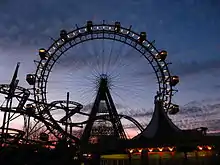 - 🌍 Riesenrad (Giant Ferris Wheel), Riesenradplatz 1, ☏ +43 1 729 54 30, fax: +43 1 729 54 30 20, info@wienerriesenrad.com. Varies by season, usually 09:00/10:00-19:45/23:45. An English engineering firm (Walter Basset) built the giant ferris wheel from 1896-97. Others of the same era, built for world exhibitions and other parks in Chicago, London, Paris, etc. have long since been torn down. The Riesenrad has become a well-known symbol of Vienna, featured in many movies (most famously in The Third Man) and picture postcards. It has 15 gondolas, some of which are incredibly ornate and large enough to host an extended family inside, offering a spectacular panorama of the city. Additionally, the cabins are available to rent, for cocktails, dinners, or special events. The travelling time is 10-20 minutes. Adult 14+ €12, child €5.