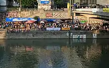 - Left Bank of the Donaukanal, Riverbank between Augartenbrücke and Franzensbrücke (Schottenring and Schwedenplatz metro stations). During the warm season, the riverbank gets incredibly lively in the evenings. Find a wide range of bars with artificial beaches serving cocktails, among them the very trendy Adria or Tel Aviv Beach. Or get some drinks from a supermarket and enjoy the party on low budget. Sit next to the river and impressive graffiti and enjoy a drink or two in the evening sun.