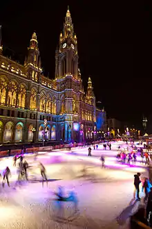 - 🌍 Wiener Rathaus (Vienna City Hall), Friedrich-Schmidt-Platz 1, ☏ +43 1 525 50, stadtinformation@post.wien.gv.at. Tours (in German) M W F 13:00, no registration required. Designed by Friedrich von Schmidt (the architect of the Cologne Cathedral) and completed in 1883, this is the most significant neo-Gothic building in Vienna, with a 103m-high clock tower. There is a very pleasant park with two fountains in front of the building facing the Ring. Free; audioguides in English/French/Italian/Spanish available with ID.