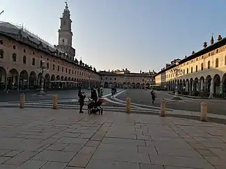 Piazza Ducale. h24. The Piazza Ducale of Vigevano is a large Renaissance-style square. Its construction began in 1492 at the behest of Ludovico il Moro as an antechamber of the castle and was completed in 1494. It is a rectangular square that winds under the arcades on three sides and which sees the fourth side occupied by the Cathedral of Vigevano. It should be noted that above each arch of the arcades there are medallions depicting historical figures of the Renaissance period with some mottos that distinguish them. The beating heart of the city, it is connected by a staircase to the Vigevano Castle and the Bramante Tower which overlooks the roofs of the center and which remains, still today, the tallest building in the city. 134 m long and 48 m wide, it is built on three sides (the fourth is occupied by the Cathedral Church of Sant'Ambrogio) with homogeneous buildings with uniform façades and arcades surrounding a forum that follows the Roman model described by Vitruvius. The area had been characterised by a wide road surrounded by buildings mostly arcaded, including that of the municipality. As a the result of the fourteenth-century expansion, it developed north of the fortified promontory of the ancient village which disappeared with the Visconti and Sforza transformations that led to the construction of the current "castle". The village and the primitive adjoining castle, located in an elevated position, was accessed by means of a ramp or perhaps a staircase placed in correspondence with the current tower which serves as the entrance to the castle. The new square was built under the direction of the ducal engineer Ambrogio da Corte with the demolition of the houses located towards the escarpment on which the castle stands and the reuse of the buildings to the north and west, aligning them with the reconstruction of the facades. The Sforza construction had the south side interrupted, in correspondence with the tower, by a wide connecting ramp between the square and the castle; the west side extended up to the escarpment of the castle (some arches with the original columns are inserted in the Commercio café) and was divided into two parts joined by a triumphal arch at the entrance to via del Popolo, while on the north side, in correspondence of the connection with the west one, just in front of the ramp, there was a triumphal arch with three arches corresponding to the entrance to via Giorgio Silva. The facades were totally decorated with frescoes very similar to the contemporary paintings of Palazzo Bottigella in Pavia. The current form is the result of the intervention of 1680, carried out by bishop Juan Caramuel y Lobkowitz, in which the ramp is demolished and a staircase is built, inserted in the completion of the missing section of the south side, part of the west side (towards the castle) is incorporated in the southern body. The layout of the square was definitively modified by Caramuel with the construction of the new facade of the cathedral: a concave facade, leaning against the church like a theatrical backdrop, which embraces and welcomes the enclosure of the square, overturning the Sforza square-castle relationship, transforming it into a square. church. In an unknown period, perhaps in the mid-18th century, the triumphal arches were replaced, completing the rhythm of the arches, with new columns of material and construction different from those of the 15th century. In the first half of the eighteenth century the Austrian occupiers placed a statue of St. John of Nepomuk, which still characterizes the western side of the square today. The pavement with pebbles and serizzo slabs dates back to the mid-nineteenth century, when the pavement of the arcades, originally in herringbone bricks, was also replaced with the current one. In 1911, by the architect Moretti, the design was made with white pebbles and the street lamps were inserted. Between 1905 and 1910 an extensive restoration was carried out which brought to light the fragments of the Sforza frescoes, hidden by the eighteenth-century paintings, by the Vigevanese painters Casimiro Ottone and Luigi Bocca, which integrates the fragments with a new pictorial decoration in Renaissance style; during the works the roofs are redone with the construction of the eclectic fireplaces and the current lampposts are installed. On the occasion of the 500th anniversary of its construction, between 1992 and 1996, the repainting of the decoration of the beginning of the century is carried out and the restoration of what remains of the original Sforza frescoes. The square is a meeting and meeting place, certainly the favourite of the Vigevanese people, and the main point of reference for tourists. It houses various shops and also the stop of the tourist train of the city. Gratis.