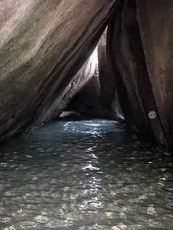 - ๐ The Baths. Virgin Gorda's most famous beach, due to its hidden caves and pools nestled amongst the giant granite boulders. As a result, it can become very crowded when the small cruise ships come calling. The best times are 8AMโ10AM, and 3PMโ5PM. Changing rooms, lockers and refreshments are available on the beach. A trail leads from The Baths through the pools and caves of the boulder field to little Devil's Bay beach. Both beaches may be reached by paths down from the parking lot at the south end of Tower Road. There is a fee for the Baths path, which is shorter and easier; cheapskates can take the Devils Bay path and reach the Baths through the boulder trail. Snorkeling is a popular activity. Moorings are provided for the many yachts that visit the Baths and Devil's Bay. $3/person.