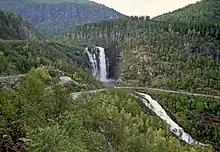 Stalheimskleiva is a one-way road going down.As of May 2021 the road is permanently closed to motor vehicles due to unstable conditions of the fundament. - 🌍 Tvindefossen Waterfall (12 km (7 mi) north of Voss driving on the E16). A 152-metre waterfall by Tvinde Camping. There is a road/footpath to the top of the falls. Kiosk. This walk combines well with a Car Walk, either to Afdal-Prestølen or Leidal-Hustveit.