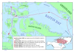 - 🌍 Beechey Island, 100 km east of Resolute, Nunavut. The expedition's first wintering location, and the burial place for their first casualties. The grave markers seen are replicas; the originals are on a Yellowknife museum. The site was not discovered until 1851, and in 1993, five archaeological sites on Beechey Island and nearby Devon Island (the Franklin wintering camp of 1845–46, Northumberland House, the Devon Island site at Cape Riley, two message cairns, and the HMS Breadalbane National Historic Site) were designated as the Beechey Island Sites National Historic Site of Canada.