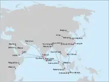 - Malacca, Malaysia — Zheng He's arrival in Malacca resulted in the Malacca Sultanate establishing a tributary relationship with the Ming, and also led to one of the earliest waves of Chinese immigration to the region. Many of these Chinese settlers married the local Malays and gave rise to the Peranakan community, whose unique culture endures to this day. The 🌍 Cheng Ho Cultural Museum, which was built on the site of Zheng He's warehouse, can be visited by people interested to learn the history. Zheng He and his men built their Southeast Asian base in the area known as Bukit Cina, where they dug seven Dragon Wells, three of which survive and have never dried even in the worst droughts. You can also visit the 🌍 Baba & Nyonya Heritage Museum, which used to be the home of a wealthy Peranakan family, and also sample the distinctive Pernakan cuisine while in the city.