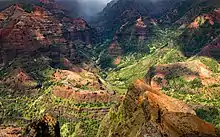 Waimea is Hawaiian for "reddish water", a reference to the erosion of the canyon's red soil. The canyon was formed by a deep incision of the Waimea River arising from the extreme rainfall on the island's central peak, Mount Waiʻaleʻale, among the wettest places on earth.