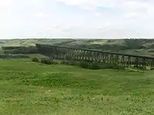 - π Fabyan Trestle Bridge (Battle River Railway Trestle), Viewpiont Road (15 km west of Wainwright; follow Hwy 14 west to Township Road 452). Built 1907-08. The steel trestle was designed by the Grand Trunk Pacific railway as part of the company's westward movement to Edmonton. Upon completion, it was the largest railway structure in Canada until the Lethbridge Viaduct was completed in August 1909. Length: 845.82 m (2,775 ft), height: 59.44 m (195 ft).