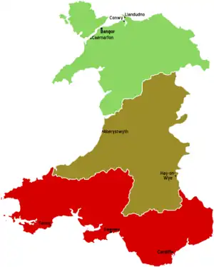 | South Wales (Pembrokeshire, Carmarthenshire, Glamorgan and Monmouthshire) The South is by far the most urbanised area. Two-thirds of the population can be found here, especially in the eastern half. The western half, frequently referred to as West Wales, is rural and includes some stunning coastal scenery. |