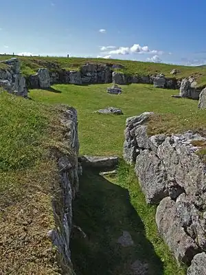 - 🌍 Stanydale Temple (southwest of Bixter). 24 hr. Large walled enclosure, once timber-roofed, dating to 2000-2500 BC. An early investigator dubbed it a "temple" as it resembles early Mediterranean temples. Whether it was primarily ritual or domestic or defensive is still debated (and whether its occupants would make that distinction), but it was obviously an important building. Not a tree for miles as you follow the lane (lane? - more like a tarmac bootlace) so the timbers were driftwood from Scandinavia. Don't take the side-lane to Staneydale, but continue by the little loch and watch for the brown signpost. An indistinct muddy path leads southwest for a mile to the site. Free.
