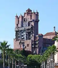 As you travel down Hollywood Boulevard, you'll find the famous intersection with Vine St., a smaller street that heads off to the left towards Echo Lake. The next intersection is with Sunset Boulevard, another major thoroughfare that branches to the right. Here you'll find more shops and more Streetmosphere, and looming in the distance is the 199-foot-tall Hollywood Tower Hotel, which houses the Twilight Zone Tower of Terror. (Why 199 feet? If it were one foot taller, it would require a blinking red light at the top under federal aircraft regulations.)