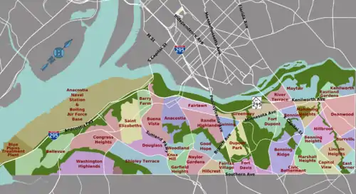 Anacostia is the popular name for the huge swathe of the capital consisting of the many neighborhoods east of the Anacostia River (often referred to as East of the River). Its heart, in the small, historic neighborhood of Anacostia, is immediately across the Frederick Douglass Bridge from the Nationals Ballpark.