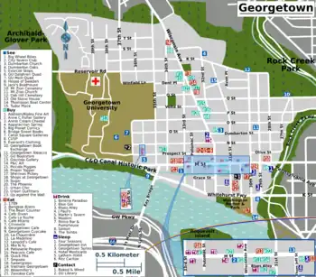 - ๐ Book Hill Park, Intersection of Reservoir Road and Wisconsin Avenue NW (behind the Georgetown Public Library). A park on what used to be a reservoir, the hilltop is now a great place to get a view of Georgetown University.