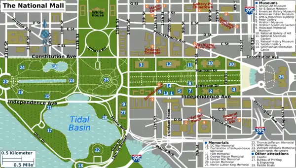 The National Mall, a national park, is a famous 2-mile-long tree-lined, pedestrian-friendly boulevard in Washington, D.C. stretching from the Capitol Building in the east to the Lincoln Memorial and Potomac River on the west. The park is home to many museums of the Smithsonian Institution, some of the best free museums in the country, as well as many famous memorials and monuments. It's the #1 destination for visitors in the city, and receives 25 million visitors per year.