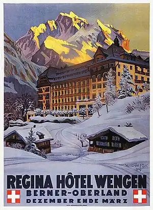 Wengen is an Alpine resort in the Bernese Highlands of Switzerland. It's at 1,274 m (4,180 ft) above sea level, reached by cog railway and with no vehicle access, on the route up towards the Eiger and Jungfrau. Its permanent population is about 1300, which swells in summer to 5000 and in winter to 10,000.