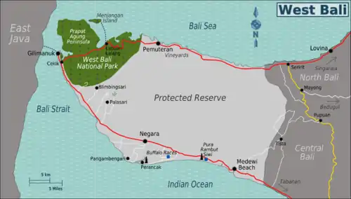 West Bali National Park covers some 770 kmΒ² and is the dominant feature of this region. All visitors should check in and purchase permits (Rp 25,000) at the main park office in the village of Cekik south of Gilimanuk. Visitors intending to visit only Menjangan Island (part of the national park), please see below. For treks through forest and into the hills of the national park, proceed to the ranger station at Sumber Klampok about 20 minutes west from Cekik. A guide is mandatory and will cost between Rp 200,000 and Rp 500,000 depending on the length and nature of your trek. Discuss all of this and make plans with the staff at the Cekik park office. If you are very lucky you might get to see a Bali Starling, Bali's only endemic vertebrate species.