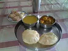 Traditional Bengali breakfast comprising of luchi with alur dom, dal and sôndesh.