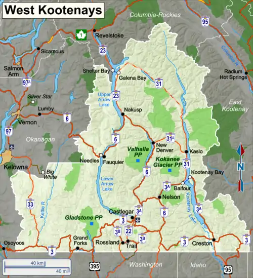 The West Kootenays is south-eastern British Columbia, Canada. The area is approximately defined as being the area south of Highway 1 (Trans-Canada Highway) from Revelstoke and including the valleys of Slocan Lake and Kootenay Lake and at least part of the Arrow Lake valley (Columbia River), as far south as the USA border.