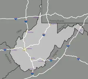 - Interstates that only cross a piece of West Virginia include I-70, which crosses from Ohio to Pennsylvania through the northern panhandle, past Wheeling; I-68, which branches off I-79 near Morgantown and passes through Preston County into Maryland; and I-81, which crosses from Virginia into Maryland and Pennsylvania through the eastern panhandle, past Martinsburg.
