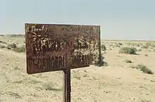 There was war in Western Sahara for over 15 years in the 1970s and 1980s, and as a result, the landmine and UXO situation to this day remains quite unclear, despite efforts of the Moroccan Government to improve the situation. There are landmines not only in the remote parts of the country close to berm, but all the way down main coastal road (N1) to the Mauritanian border. Google Earth clearly shows the efforts to clear minefields all along N1, which continue to this day—despite Moroccan officers tending to tell tourists that this part of the country is safe. Around the settlements (Boujdour, Ad-Dakhla, Golfe de Cintra) the situation seems to be slightly worse, possibly due their strategic significance in the war. The warning signs are sometimes so rusty that they can't be recognised anymore, but usually the combination of two small metal signs is a strong indicator.