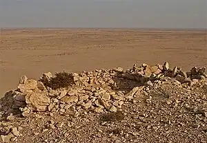 Mostly low, flat desert, with large areas of rocky or sandy surfaces rising to small mountains in south and northeast. Low-lying sand dunes cover the territory.