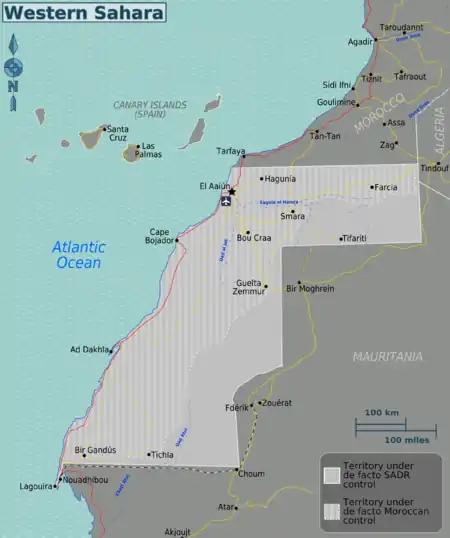 Western Sahara is an area on the west coast of North Africa. A former Spanish colony, its governance is disputed between Morocco and the Sahrawi Arab Democratic Republic (SADR). After a UN-brokered ceasefire in 1991 ended a war between the two, Morocco ended up de facto controlling about 80% (and almost the entire coast) of the disputed area, with SADR controlling the region around the Mauritanian and Algerian borders. The Berm is the de facto border between the two administrations, and the areas around it are full of landmines.