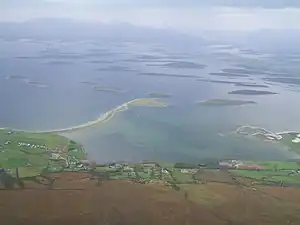 - Clew Bay is a beautiful bay dotted with small islands - there are 141 named islands and outcrops, which you see more of further north towards Newport. They're drumlins, mounds of gravel deposited by glaciers. (There's a swathe of them right across Ireland where the last glaciation halted: on land, eg in County Cavan, they create a "basket-of-eggs" landscape.) Most are uninhabited, several have private dwellings; boat trips go out from Westport harbour. To view from the mainland either take the south shore road towards Louisburgh and Roonagh, or the north shore road towards Achill Island.