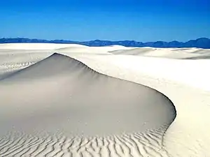White Sands National Park is an American national park in the southeastern region of the state of New Mexico. The park contains the world's largest gypsum sand dune field—275 sq mi (710 km2) of fine white sand, formed by the prevailing winds into large ridge-like dunes.