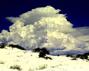 The Tularosa Basin, a high desert area, averaging 4,000 feet (1,200 m) in elevation, is subject to harsh, and sometimes rapidly changing climatic conditions. Summers are hot, with high temperatures averaging 95 °F (35 °C) 95°F (35°C) in July and August. Winters are relatively mild, but nighttime temperatures often go below freezing (32 °F (0 °C)) and cold spells can send the mercury below 0 °F (−18 °C). The lowest recorded temperature is −25 °F (−32 °C). Snowfall is infrequent, but heavy snows have occurred on occasion. Precipitation averages about 8 inches (20 cm) per year, with most falling during summer thunderstorms, often accompanied by lightning and hail.