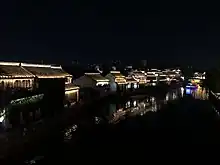 - 🌍 Yuehe Street (月河街, Moon River Street), Zhongji Road and surrounds. Another restored neighbourhood, this one on the north side of the old city, Yuehe Street or "Moon River Street" is named after a system of canals connected to the city moat, so-called because they are curved like the crescent moon. This used to be a centre of traditional commerce and light industry. As opposed to the elegant houses of prominent people featured on Meiwan Street, Yuehe Street features authentic shop and workshop buildings of a more "commoner" type, with numerous tea rooms, small restaurants, and sellers of Chinese cakes and baked goods. If your itinerary does not allow you to go on to Xitang or Wuzhen, Moon River Street is a good taste of what those canal towns are like. The Museum of Zongzi Culture is dedicated to the leaf-wrapped rice balls for which Jiaxing is famous. There are some large hotels in the same neighbourhood based in restored or newly built but traditional style houses.