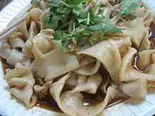 面) is a local provincial specialty noodle dish that is extremely good. The wide noodles are spiced, have a broth, and include toppings such as eggs, tomatoes, beef, etc. The character for "biang" is very complex (58 strokes) and distinctive. Although this kind of noodles has created a brand of the same name (trademarked), under which several such restaurants are run across the whole city, not every one serves the noodles that taste like the original. It's advised to go to the one restaurant that has lasted for the longest time, which is located in Fen Alley, within the City Walls. It is know by the locals as the most "authentic" (正宗) Biáng biáng miàn. - Ròu jiā mó (肉夹馍) is the closest thing to a hamburger. This is a local tradition and should be very easy to locate. Sandwich-like, with pork, beef or lamb, this is a must-try item for anyone who is in this area. Still, as a dish that is derived from Hui people's cuisine, the best Ròu jiā mó restaurant is to be found usually within the City Walls, specifically in the Hui Muslim Quarters. Not every Ròu jiā mó restaurant in the city serves the food just like the original. A recommendation of such an "authentic" restaurant would be Yú Lǎo Dà (literally translated as "Mr.Yu's") located in the Wuxing Street, just across the Roman Catholic church. It mostly serves food for breakfast, so get in there in the morning just in case it closes at noon.