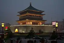 - 🌍 Bell Tower (钟楼; Zhōnglóu), Intersection of East Avenue and South Avenue, Lianhu District (莲湖区东大街和南大街交汇处) (on traffic island in dead center of the city; take a metro train to Zhonglou Station on Line 2), ☏ +86 29 87278797, xazglbwg@126.com. In high season (April 1st to October 10th), opening hours are 08:30-21:30, the last combo tickets are sold at 19:00, and the last standard tickets are sold at 21:00. In low season (October 11th to March 31st), opening hours are 08:30-18:00, the last combo tickets are sold at 16:30, and the last standard tickets are sold at 17:30. The traffic island is almost ringed by a subway, enter from north side next to Metro entrance. Great tower with ancient bells to toll the time for the city. Short musical performances every hour or so. ¥30, or ¥50 including Drum Tower.