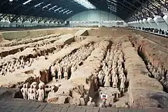 - 🌍 Army of Terracotta Warriors and Horses (兵马俑; Bīngmǎyǒng) (a short distance away from the Qinshihuang Mausoleum, it is the last stop of bus (5)306/307, which can be boarded at the main train station (to the right as you face the station); if there is a long queue, or on the way back, look for private bus companies who also service the route to Bingmayong for about the same price (¥7 or 8)). This mighty army of terracotta warriors and horses, found in three vaults, is perhaps the most popular tourist attraction of Shaanxi and one of the most popular in all of China. An in-site museum has been built over these pits, covering a floorspace of 20,000 m² and housing 8,000 lifelike terracotta warriors, 100 or so chariots, and 40,000 weapons, allegedly crafted to replace actual human sacrifices that had been commonplace in previous dynasties. Not all of these are on display, and the site is still an active archeological dig. There are 3 pits (numbered and clearly signposted 1,2,3). Going from pit 3 to pit 2 to pit 1 means that each pit gets more impressive and ensures a grand finale. The assemblage has been billed by the tourist industry as the Eighth Wonder of the World and a world cultural heritage site by UNESCO in 1987. The ticket office is next to the parking lot, which is a 5/10 minute walk away from the entrance to the museum. Buy your tickets at the ticket office or you can also buy them from resellers at the entrance for a ¥5 fee. For ¥5, you can opt to take a small bus from the ticket counter to the entry to the site, which saves you about 10 minutes of walking. On the way back, however, you are forced to walk in order not to "miss" the countless opportunities to buy small terracotta warriors, other tourist articles and food. For those not interested in Chinese food you will pass a Starbucks, McDonald's and there is a KFC very near to the ticket counter. Student tickets can only be bought, with a Chinese student card. When buying your ticket you are likely to be approached by a 'guide', especially if you look foreign. The normal starting price is ¥200 but you should be able to bargain them down to around ~¥75. ¥100 is reasonable for the 2 - 3 hours they will accompany you. When talking to them, take the time to evaluate how they speak, because if you can't understand them at the start it'll just get worse. Inside Pit 1, there is a 'photo spot' to the left of the entry when you can be escorted to one of the nicer places. However it costs ¥200 for ~15 min (but includes a picture). You won't miss much but not doing it; but you will have 15 min with no one jostling you on either side and an uninterrupted view of the warriors. ¥120, students ¥60.