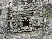 Structure I is the most interesting feature of Xpujil. Each of the three parts has a characteristic steep staircase, and there are mock staircases on the upper levels. Each of the three towers was topped by a pyramid, though only the central tower's pyramid is in good condition. The monster mask theme is carried through the three towers, with the giant serpent mouth of the central tower being the most unsettling.