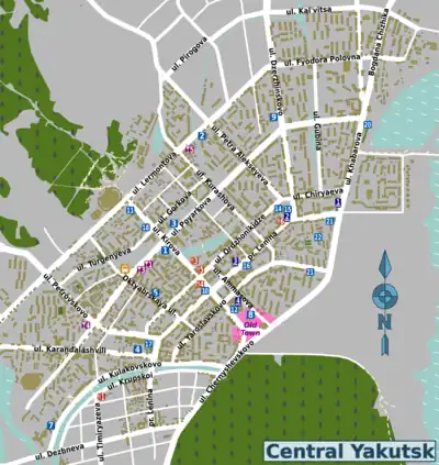 - 🌍 Tygyn Darkhan (Тыгын Дархан), ul. Ammosova, 9, ☏ +7 4112 43-51-09. In the center of the city, it hosts one of the best known local restaurants (see above), a souvenir shop, bar, conference room, exercise room, sauna, pool, money change, and breakfast included. From 3,240 rubles.