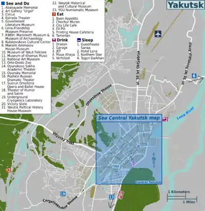 - Chochur Muran (Чочур Муран), Viliusky trakt, 6 km, ☏ +7 924 661-61-00, chochur-muran@mail.ru. Daily 12:00-00:00. A restaurant just outside the city in a picturesque location in a tower of the on-site replica of the Lensky Fort. Chochur Muran specializes in Yakut fish dishes. The ambiance is nice, with a Yakut mini-museum, dog-sledding and snowmobiling outside in the winter, and ice sculptures. 600-2000 руб.
