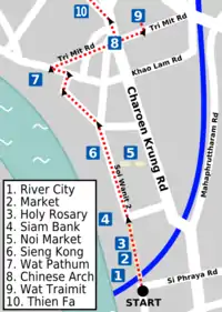 When leaving River City, you might see the sign "Gateway to Chinatown" and a map of a guided tour through the area. That tour is different from the one shown here, though some places are visited in both tours. Move on and take a left into the small market on Soi Wanit 2. Here you can get some snacks from a cart and take a seat before the big hike. You can also get some water around here if you wish. From the market you can see the Holy Rosary Church, often called Kalawar Church by locals. It is a Catholic church built in 1897 in neo-Gothic style architecture. Seeing it from the front is complicated, as a school yard takes up all the space. When you leave the church, take a left and try to find the riverside Siam Commercial Bank Building, the first commercial bank set up by Thais. It was built in 1906 in Art Deco style, a style that was popular at that time. It is difficult to find though, but is easily seen from the Chao Phraya Express Boat service.
