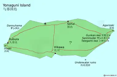Also known as Dunan (どぅなん) in the local language, Yonaguni is a small island (28 km2) 125 km (78 mi) from Taiwan and 127 km (79 mi) from Ishigaki. The main population centers are Sonai (祖内) on the north coast, the smaller port town of Kubura (久部良) on the west coast, and tiny Hikawa (比川) in the south. The total population is about 1700.