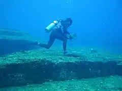 Yonaguni's unique attraction is the mysterious 🌍 "underwater ruins" (海底遺跡 kaitei iseki). Dryly but diplomatically referred to by the government as the "Underwater Landscape Resources" - which lie off the southern coast of the island. A single platform 100 by 50 meters (330 by 160 ft) wide and up to 25 m (82 ft) tall, seeming carved out of solid rock at perfectly right angles and dated by some to be 8000 years old, the technology required to build them here doesn't seem to match any known timeline of human history. Some maintain that they are the product of the lost Continent of Mu or even alien artifacts, though the majority of scientists think they were created by natural geological processes. But the (apparent) hallways and staircases, as well as what appear to be regular rows of holes dug for moving rock and even what some take to be a form of writing on the walls, keep visitors intrigued.