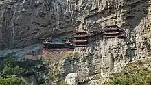 - 🌍 The Hanging Monastery (悬空寺 Xuánkōngsì) (65 km to the southeast of Datong. From Datong train station, fifth stop on bus line 15 takes you to 市供排水集团 Shìgōng Páishuǐ Jítuán. From there, walk ahead to crossroads, turn left and main bus station 大同汽车站 Dàtóng Qìchēzhàn is just ahead on left. [May 2013 : bus station moved because of works, still take bus 15 but ask the driver for the main bus station 大同汽车站 Dàtóng Qìchēzhàn which is now around 10 stops from the train station] Window 2 sells ¥26 tickets to 悬空寺 Xuánkōngsì. Buses leave frequently. After nearly a 2 hour journey you will be dropped off in a place where you can get a taxi for the final few miles. Prices seem to vary according to how much the taxi driver thinks he'll get from you, specially in Winter when there are not many taxis available. For coming back, there are taxis when exiting the monastery that go to Datong when they are full. In winter the taxis will drop you off back at the bus station. Expect to pay 50% to 100% more than what you paid for the first leg of the trip, and expect a 50% higher price if a toot take you to the taxi. If you are not fluent in Chinese you might find it cheaper and faster to arrange the transport to and from the monastery directly in Datong's bus terminal: many taxis and vans seem to be available for hire in the morning.). Lodged precariously on a cliff-face, this monastery is one of the more remarkable sights in China: a complex of 40 rooms linked by mid-air walkways. It appears to be stuck into the side of the cliff, but is actually supported by stilts. There is a '3 Religions Hall' with all of Buddha, Confucius and Laozi (founder of Daoism). Built in 490, renovated several times, most recently in 1900, much of the current structure dates from the Ming and Qing Dynasties. Less than an hour to visit and not for the faint of heart. The roads may be closed in winter after heavy snowstorms and it is not recommended in rainy days for the slippery ladders. The ticket checkers are supposed to only let 80 people in at a time but the monastery can be crowded as not everyone follows the same flow around. Stick to the walls! Entry full ¥130 summer, ¥125 winter. Students, 60-69 half price. Disabled (残疾人), military, 70 and over, less than 1.2 m tall children free. Discounts require documents..